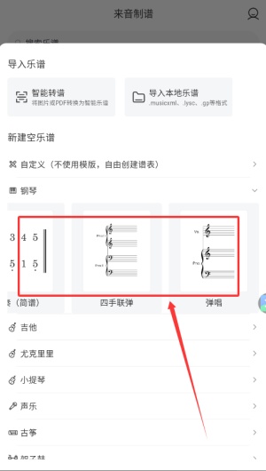4、根據樂曲風格選擇對應的樂譜類型,并完成添加操作。